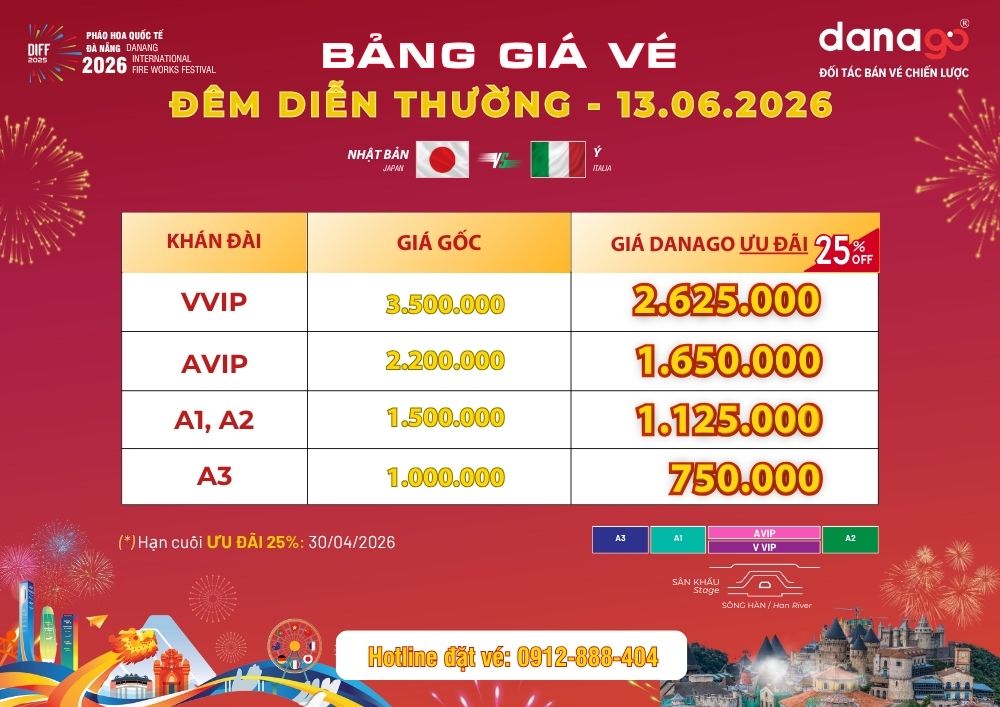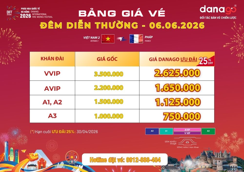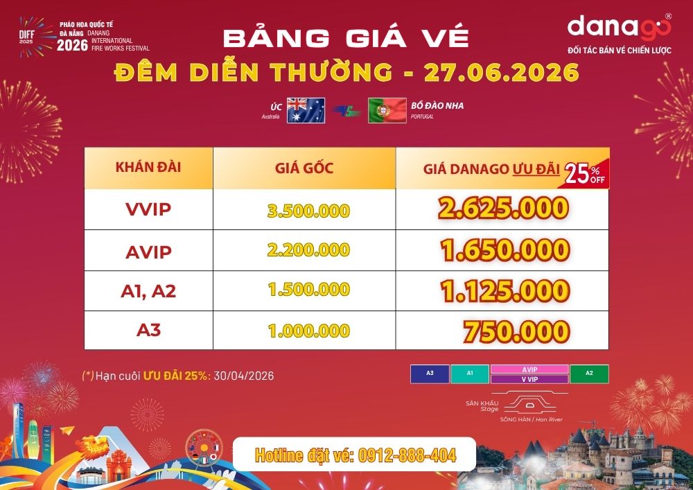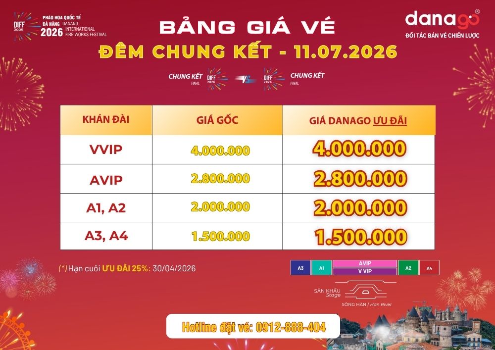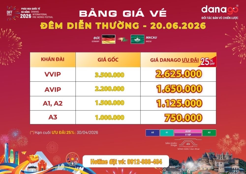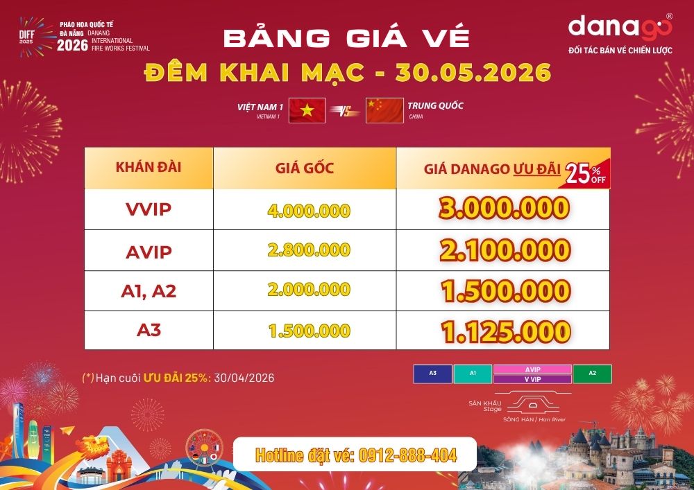 ƯU ĐÃI NGAY 25% khi đặt vé pháo hoa Đà Nẵng sớm tại Đối tác phân phối chính thức DANAGO. Chương trình ưu đãi đặc biệt này kéo dài đến hết ngày 30/04/2026.